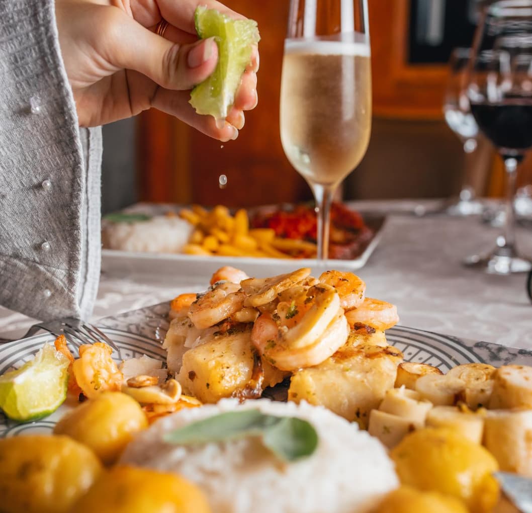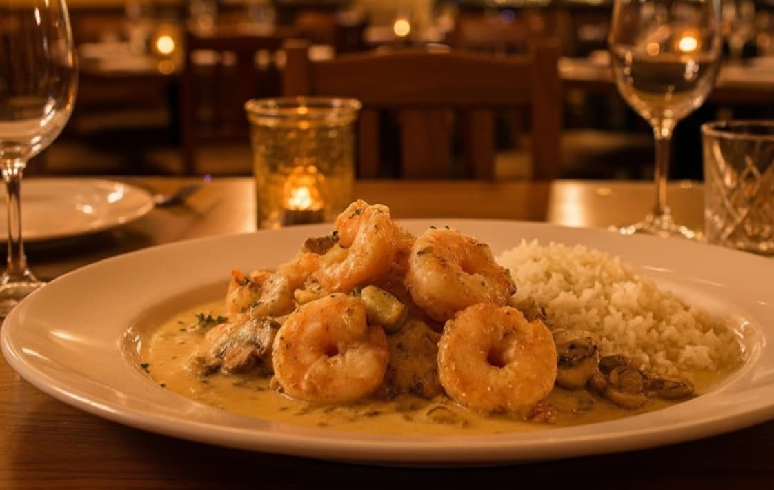 (grelhado, molho de manteiga, camarão, champignon, tempero verde, batata ao vapor, palmito, arroz)