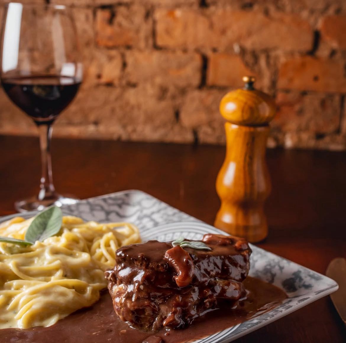 Maison(recheado com queijo, molho de vinho, champignon, acompanha porção de fetuccine aos quatro