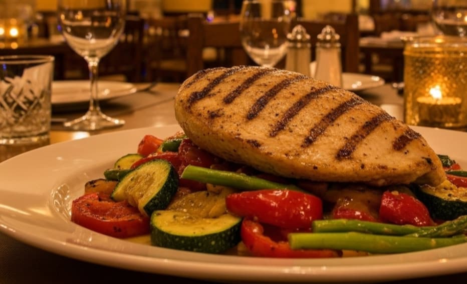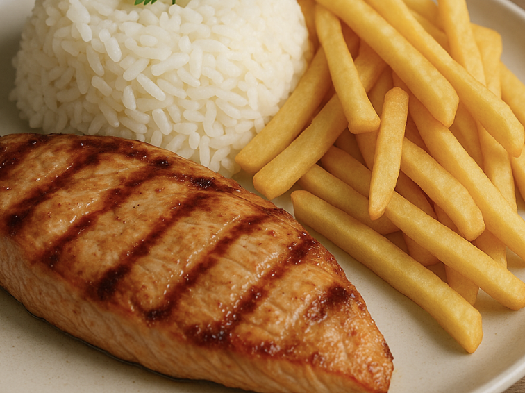 (grelhado, aspargos, molho branco, batata ao vapor, brócolis, arroz)