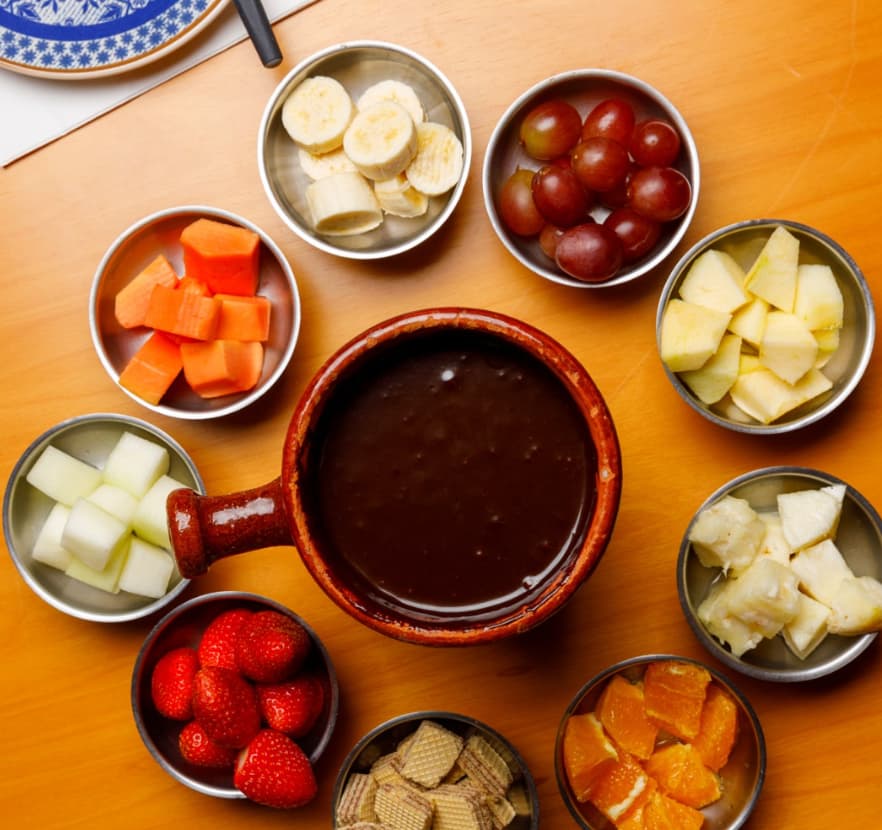 (queijo gruyere, carnes na pedra ou bourguignonne, chocolate ao leite, chocolate branco e doce de leite)
